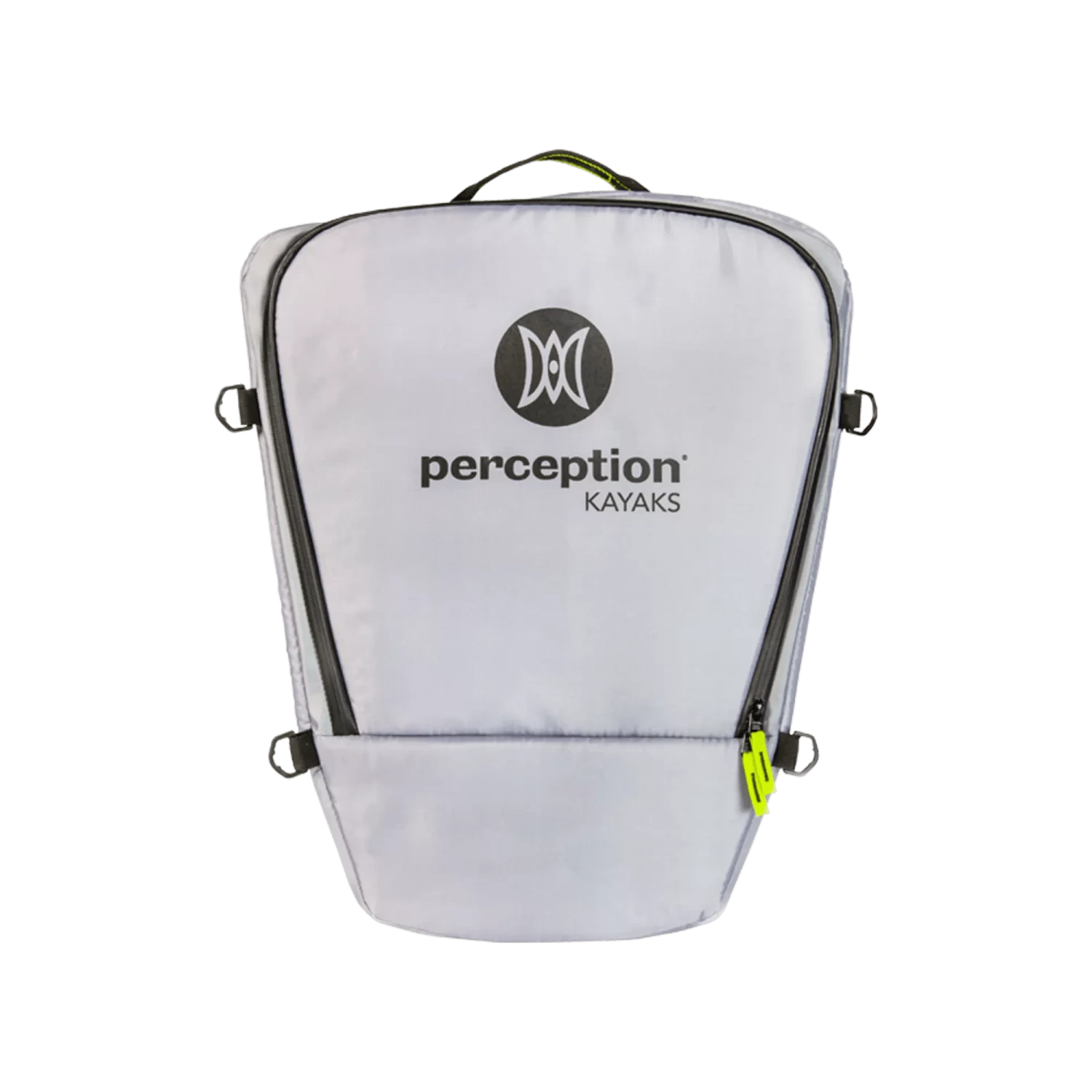 The ultimate kayak soft cooler has arrived and is designed to fit perfectly in the storage wells of sit-on-top kayaks. It’s versatile enough for everyday use too! With a zippered opening on top for ultimate convenience when accessing drinks and food, this cooler also has a low-profile shape to minimize the impact of wind. The YKK water-resistant zipper, water-proof materials, and RF-welded internal seams keep splash and rain out, while the ½” thick insulating foam keeps drinks and food cold all day. Adjustable backpack-style shoulder straps and a strong haul handle make portage easy. 4 D-rings in each corner allow for lashing down to the kayak, and a heavy-duty material on the bottom panel adds durability. This cooler has a capacity of 40 L and can hold 20 cans assuming a 1:1 ratio of ice. It is not intended for submersion or storing fish. The external dimensions are 21.5” L x 8” H x 17.75” W (10” W at small taper side), and the internal dimensions are 18.5” L x 7” H x 16.5” W (9.5” W at small taper side). This cooler is compatible with most sit-on-top kayaks with storage wells and Perception Hook and Perception Sound 10.5 sit-inside models (note: not compatible with the Sound 9.5). Get ready for the ultimate kayaking experience with this soft cooler!